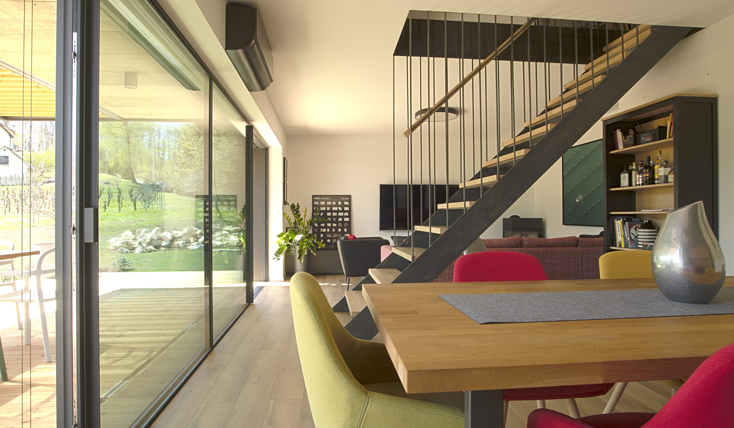 Obje zone orijentirane su na veliku staklenu stijenu koja pruža impresivan pogled na šumu i vinograde. Za razliku od prizemnog dijela, koji je otvoren i apsorbira sve elemente okoline, prostori prvog kata potpuno negiraju njezinu prisutnost orijentirajući se, preko krovnih prozora, isključivo prema univerzalnom prirodnom elementu – nebu. Doživljaj eksterijera kuće temelji se na tri osnovna materijala – glinenim Tondach Plan 30 pločicama kojima su obložene krovne plohe i dulje stranice fasade; staklu te drvu zabatnih zidova; “deckinga” terase i pergoli nad jednim njezinim dijelom. Aluminijski detalji i sirovi beton podgleda nadstrešnice zaokružuju cjelinu i osnovnu arhitektonsku ideju fuzije tradicionalnih i modernih stilova oblikovanja. Budući da lokacija nije opremljena komunalnom infrastrukturom (osim priključka na elektroenergetsku mrežu) - primijenjen je široki spektar održivih tehničkih rješenja za vodoopskrbu, odvodnju i KGVH sustav; od kolektora kišnice i biološkog pročistača otpadnih voda pa sve do dizalice topline, što je u rezultiralo suvremenom, ekološki prihvatljivom i održivom građevinom.